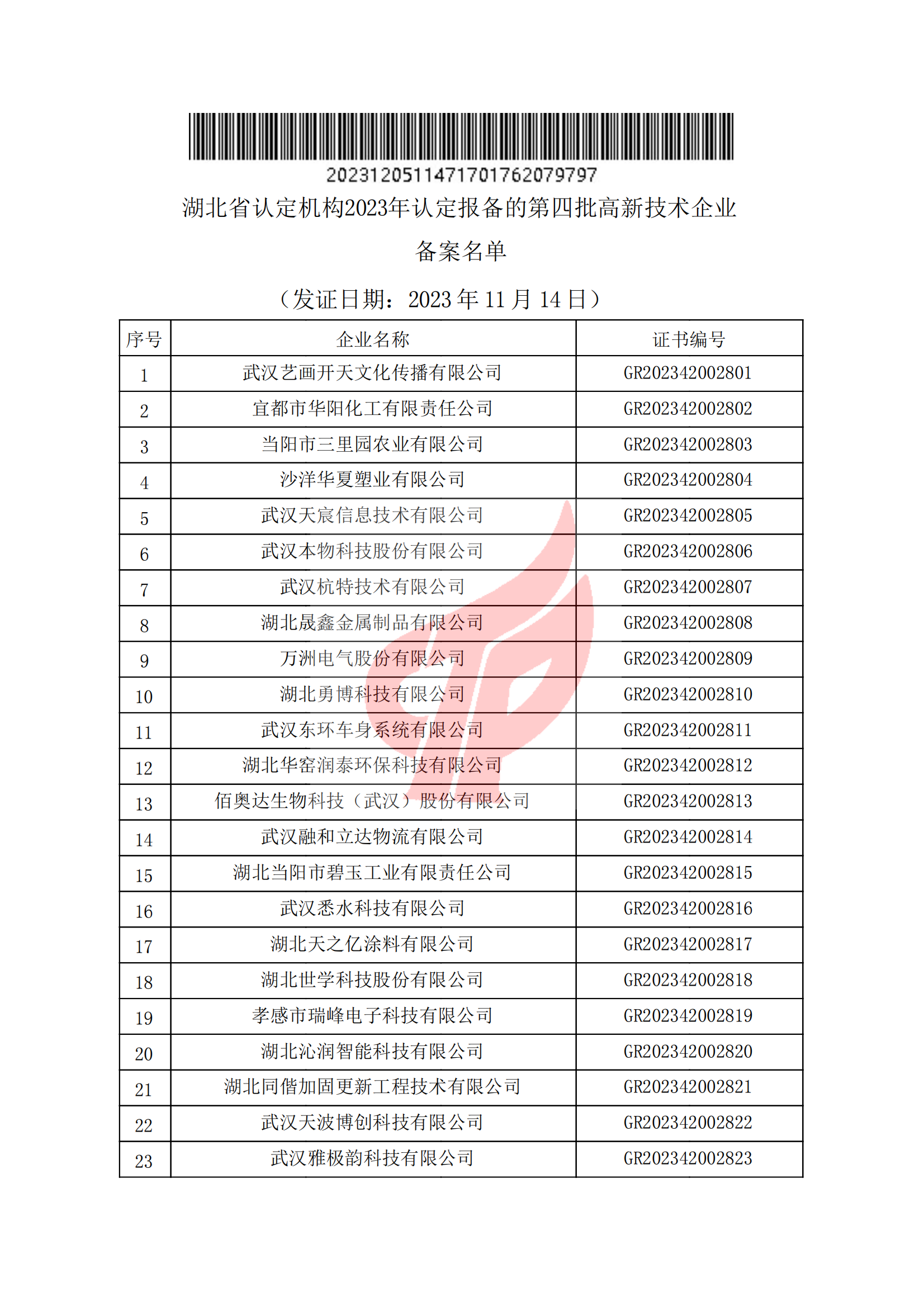 【高企认定】对湖北省认定机构2023年认定报备的第四批高新技术企业进行备案的公告